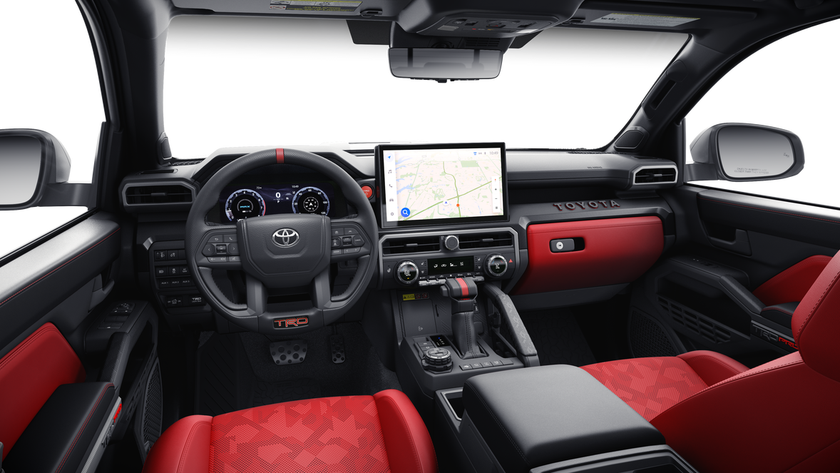 - TRD Pro leather-trimmed manual tilt/telescopic steering wheel with TRD badge, red center stripe, and phone, audio, display/infotainment, and Driver Assist controls